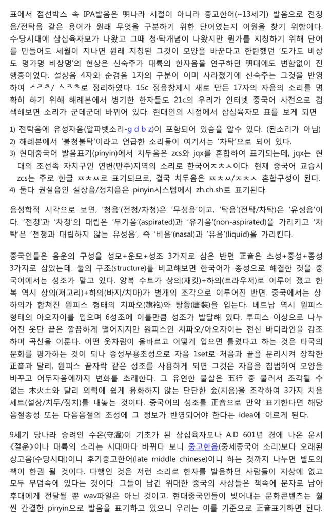 참고로 대륙의 한자독음은 상고한음-중고한음을 거쳐 현대중국의 소리로 계속 변화했지만, 중고한음(3세기~13세기)이 사용되던 6세기 당나라~12세기 북송때까지가 대륙이 주변국가들에게 끼치는 문화적 경제적 영향력이 컸기 때문에. 마치 중세 서울경기 방언이 현대서울이 아니라 오히려 제주도 지역에서 잘 보존되어 관찰되듯이 영상속 조기중고한음(early middle chinese) 를 들어보면 한국인들의 한자독음과 유사하다. 숫자는 적지만(중국내 3천만명) 중요한 역할을 차지해 대륙의 유대인이라고 불리는 객가인(客家/Hak-ka) 또한 중고한음으로 독음한다. 스크린에서는 장국영, 주윤발, 유덕화, 주걸륜, 허우샤오셴 감독이 있고, 정치계에서는 홍수전, 쑨원, 덩샤오핑, 주더, 리덩후이, 마잉주, 차이잉원, 리콴유, 리셴룽, 태국 탁신前총리도 객가인 출신이다