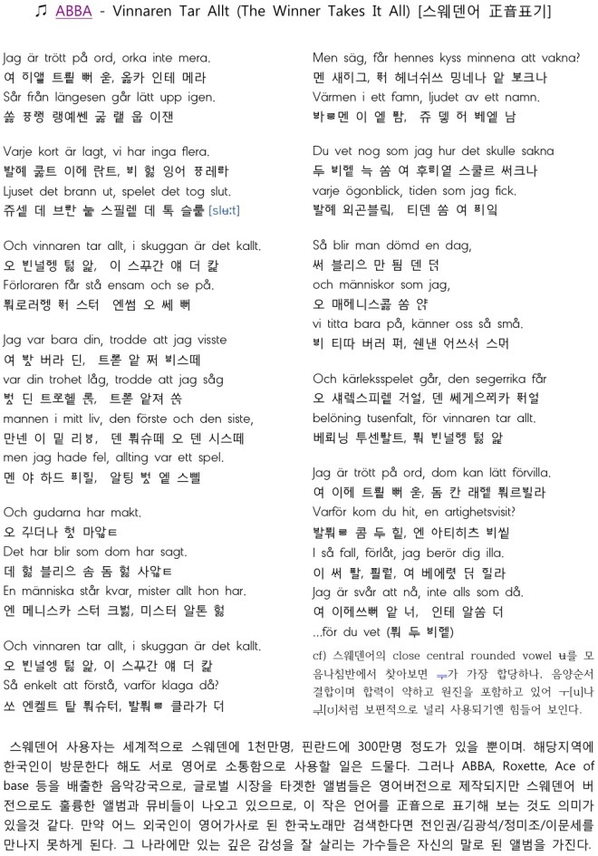 ABBA – Vinnaren Tar Allt (The Winner Takes It All) [스웨덴 正音] 사진을 클릭하면 스웨덴 장모음/단모음을 직접 들어볼 수 있다. 이 글 공유하기:공유 클릭하여 친구에게 이메일로 링크 보내기 (새 창에서 열림) 전자우편 클릭하여 X에서 공유 (새 창에서 열림) X Tumblr로 공유하기 (새 창에서 열림) Tumblr Telegram에 공유하려면 클릭하세요. (새 창에서 열림) Telegram LinkedIn으로 공유하기 (새 창에서 열림) LinkedIn Reddit으로 공유하기 (새 창에서 열림) 레딧